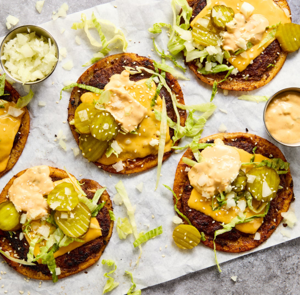 Ingredients: Burger Sauce - 1/4 cup mayonnaise - 2 Tbsp. ketchup - 1 Tbsp. sweet pickle relish - 1 Tbsp. yellow mustard - 1 tsp. hot sauce Smash Burger Tacos - 1 lb. ground beef - 6 (5") flour tortillas - 2 tsp. store-bought or homemade burger seasoning - Kosher salt - 6 Tbsp. neutral oil, divided - 6 slices American cheese, divided - 18 thin bread-and-butter pickle slices - 1 cup shredded iceberg lettuce - 3 Tbsp. chopped yellow onion - White sesame seeds, for serving Directions S Burger Sauce Step 1 - In a small bowl, mix mayonnaise, ketchup, relish, mustard, and hot sauce until combined. Step 2 - Make Ahead: Sauce can be made 3 days ahead. Cover bowl and refrigerate. Smash Burger Tacos Step 1 - Divide beef into 6 portions about 2 1/2 ounces each. Top each tortilla with a portion of beef. Using a fork, flatten beef on top of tortilla into an even layer, leaving a 1/2" border. Sprinkle with 1/2 teaspoon burger seasoning; season with a pinch of salt. Step 2 - In a large skillet over medium-high heat, heat 2 tablespoons oil and swirl pan to coat. Arrange 2 tacos beef side down and press into skillet to flatten with a sturdy spatula or burger press. Cook, undisturbed, until beef is browned and cooked through, 2 to 3 minutes. Flip tacos, top each with a slice of cheese, and cook until cheese is slightly melty, about 1 minute more. Transfer to a baking sheet. Repeat with remaining 4 burger tacos. Step 3 - Top each taco with burger sauce, pickles, lettuce, onion, and sesame seeds.